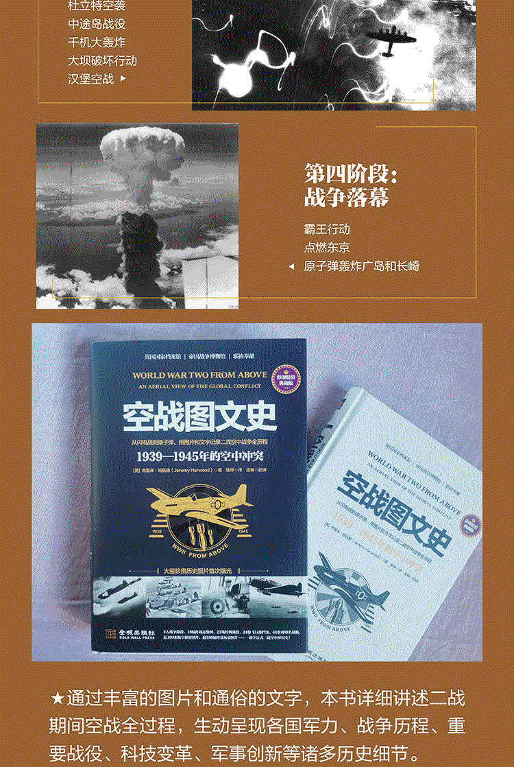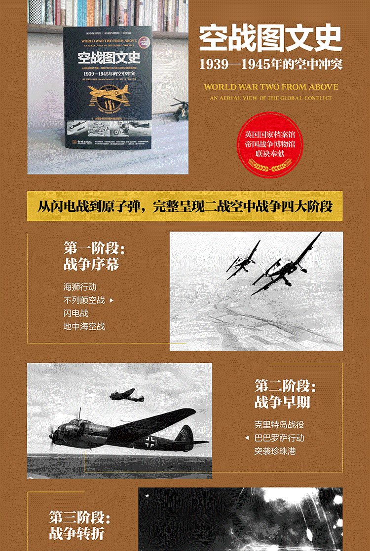全書涵蓋4大戰爭階段、18幅作戰態勢圖、21場經典戰役、24份飛行器檔案、40餘種知名戰機、近100張航空偵察照片、超180幅珍貴歷史圖片,還涉及大量武器裝備和歷史人物,堪稱一部全景式二戰空中衝突史,也是一部近代航空科技發展史。
