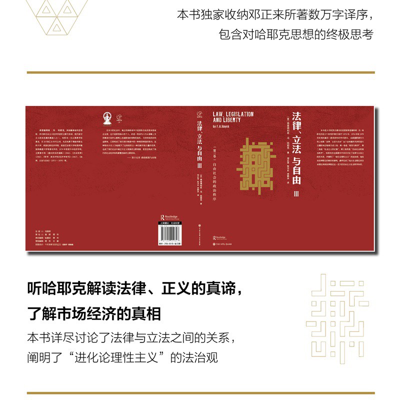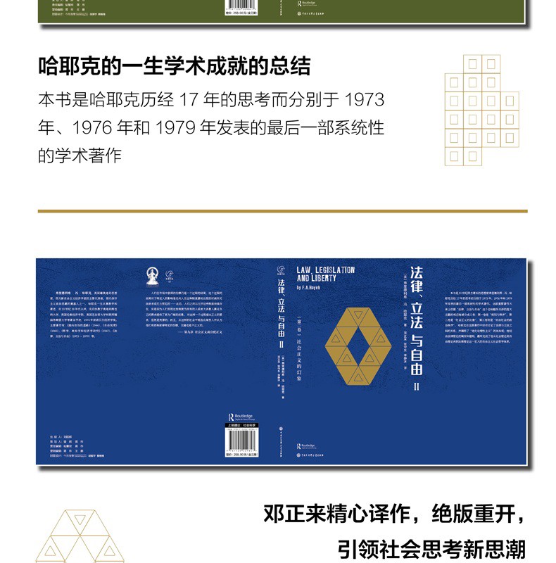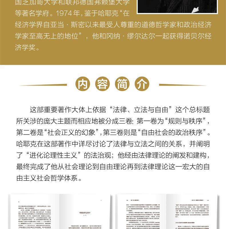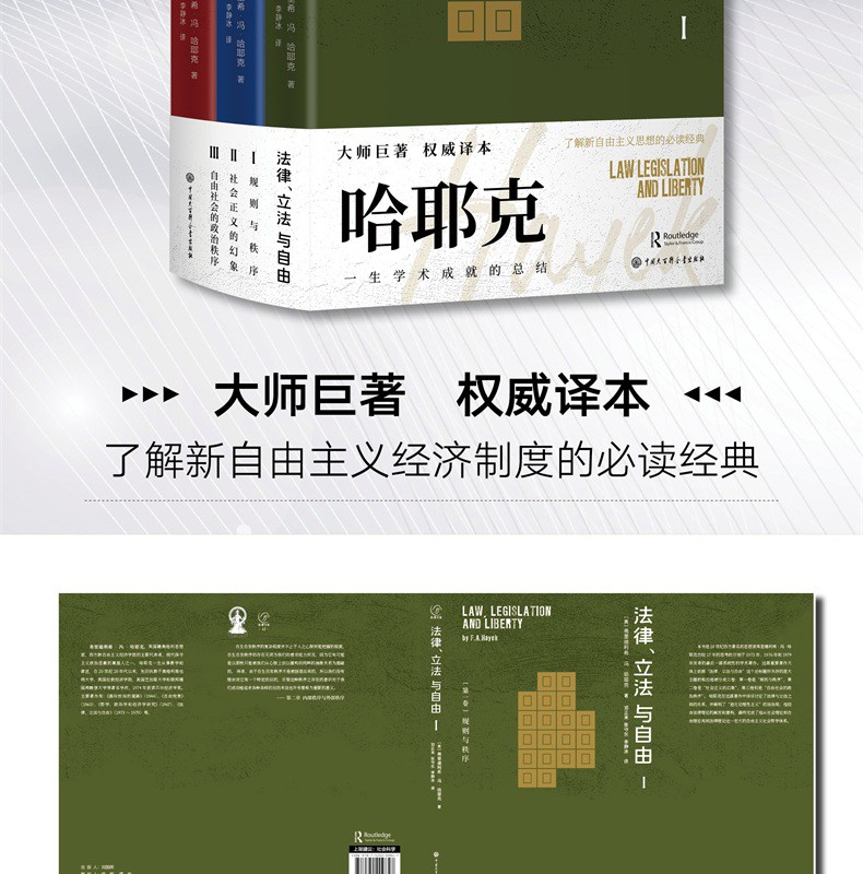 本書是哈耶克歷經17年思考創作出的後一部系統性的學術著作。 其間詳盡討論了法律與立法之間的關係,闡明了“進化論理性主義”的法治觀,是他從社會理論到自由理論再到法律理論這一宏大的自由主義社會哲學體系終形成的收官之作。 書籍本身學術價值巨大,原本作為“外國法律文庫”叢書的其中一本在初次出版之時就已經收到了不錯的市場反響。 書中關於自由主義、法律與立法的探討,在依法治國不斷深入推進的當下,仍然有非常深刻的現實指導意義,毫不過時。 但是隨著時間的推移,舊版在裝幀、設計及內文表達形式等方面開始落後於時代,囙此現擬推出新版,相信這套曾經創造輝煌成績的圖書經過改頭換面,在市場上能够重新獲得讀者的認可。