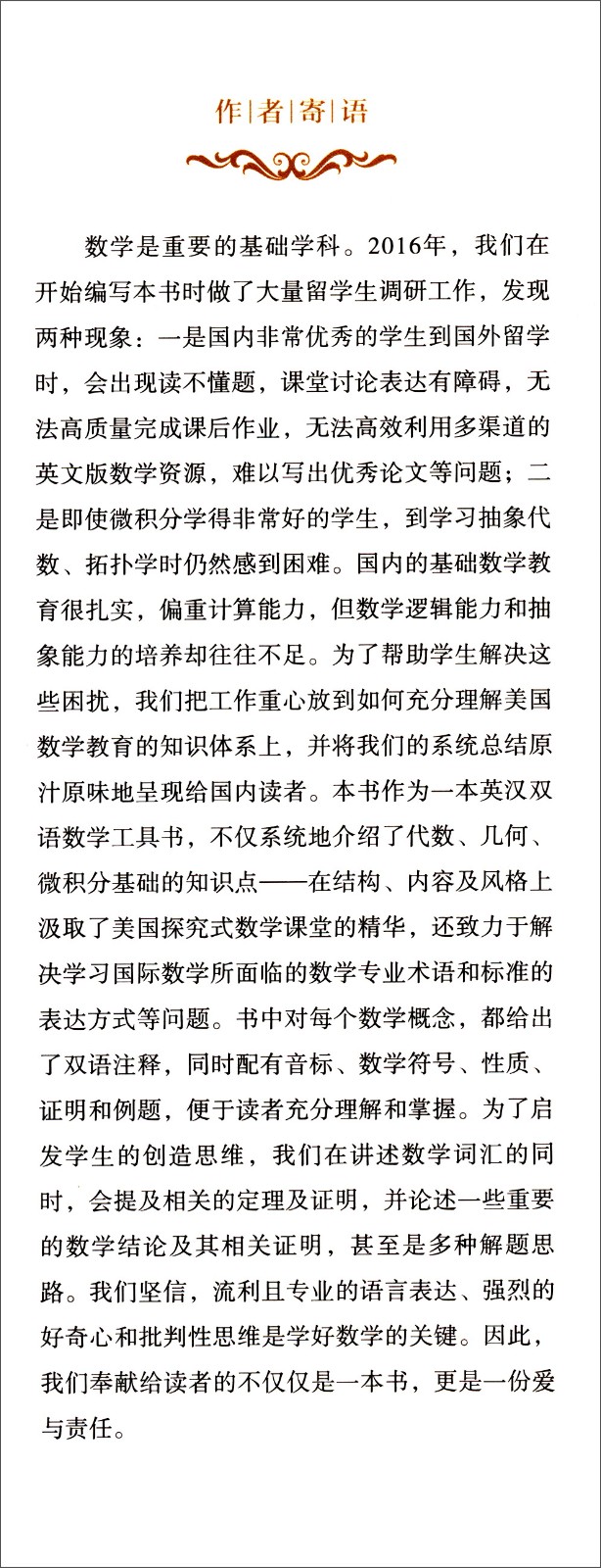 數學是重要的基礎學科。 2016年,我們在開始編寫本書時做了大量留學生調研工作,發現兩個現象:一是國內非常優秀的學生到國外留學時,會出現讀不懂題,課堂討論表達有障礙,無法高質量完成課後作業,無法高效利用多渠道的英文版數學資源,難以寫出優秀論文等問題;二是即使微積分學得非常好的學生,到學習抽象代數、拓撲學時仍然感到困難。國內的基礎數學教育很紮實,偏重計算能力,數學邏輯能力和抽象能力的培養往往不足。為了幫學生解決這些困擾,我們把工作重心放到如何充分理解美國數學教育的知識體系上,並將我們的系統總結原汁原味地呈現給國內讀者。本書作為一本英漢雙語數學工具書,不僅系統地介紹了代數、幾何、微積分基礎的知識點——在結構、內容及風格上汲取了美國探究式數學課堂的精華,還致力於解決學習國際數學面臨的數學專業術語和標準的表達方式等問題。書中對每個數學概念,都給出了雙語註釋,同時配有音標、數學符號、性質、證明、造句和例題,便於讀者充分理解和掌握。為了啟發學生的創造思維,我們在講述數學詞彙的同時,會提及相關的定理及證明,並論述一些重要的數學結論及其相關證明,甚至是多種解題思路。我們堅信,流利且專業的語言表達、強烈的好奇心和批判性思維是學好數學的關鍵。因此,我們奉獻給讀者的不僅僅是一本書,更是一份愛與責任。