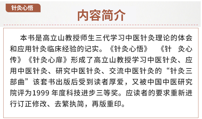 《針灸心傳》是高立山教授師生三代學習中醫針灸理論的體會和應用針灸臨床經驗的記實。 《針灸心悟》《針灸心傳》《針灸心扉》形成了高立山教授學習中醫針灸、應用中醫針灸、研究中醫針灸、交流中醫針灸的「針灸三部曲」。 該套書出版後受到讀者厚愛,又被中國中醫研究院評為1999年度科技進步三等獎。 應讀者的要求重新進行訂正修改,再版重印。