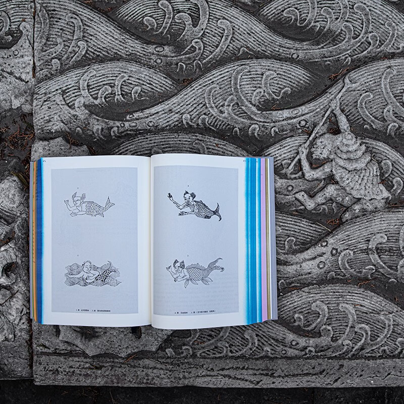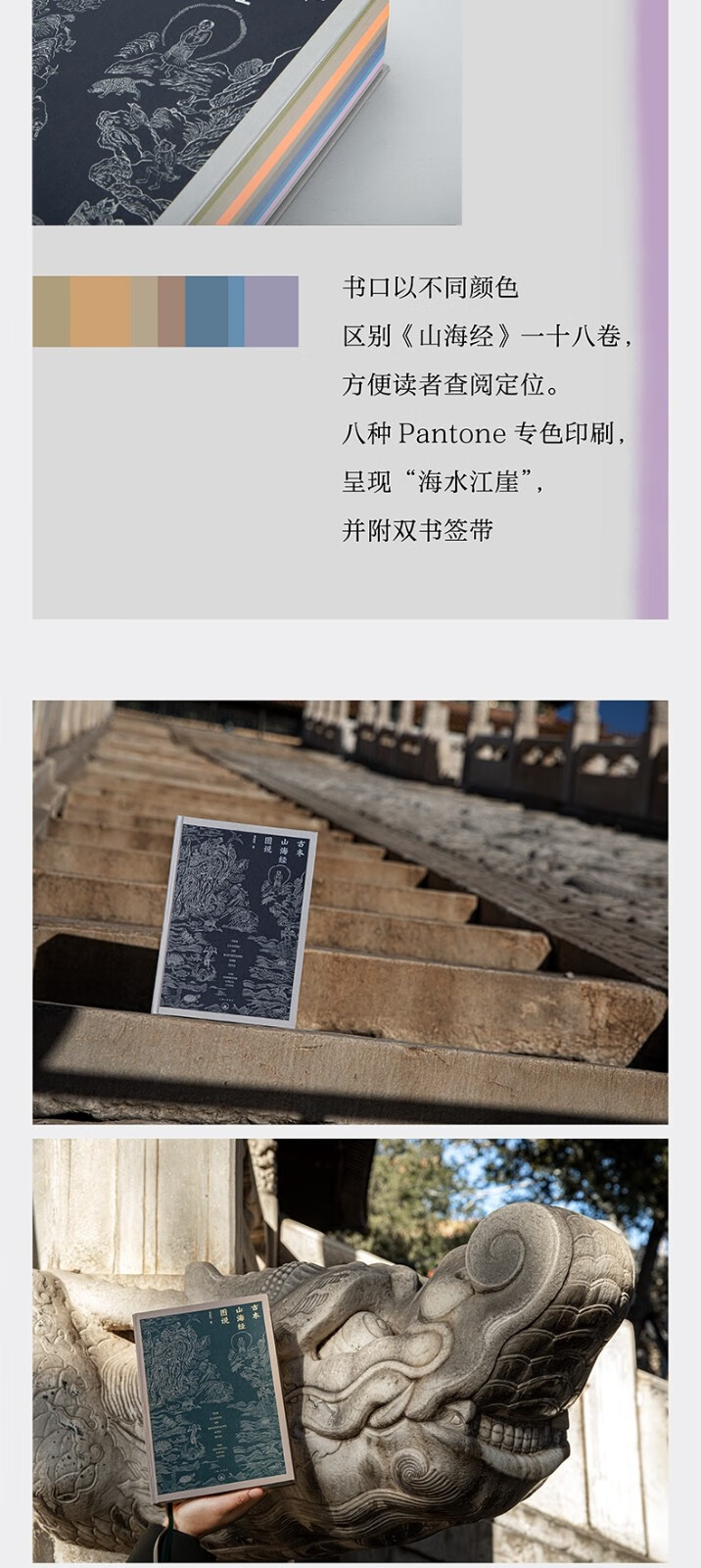 書口以不同顏色區別《山海經》一十八卷,方便讀者查閱定位。 顏色設定靈感取自中國傳統古建彩繪上的“五彩斑斕”。 其中,五藏山經五卷取黃色“對暈”,海荒經十三卷取藍色“退暈”,由淺至深再由深至淺,八種Pantone專色印刷,呈現“海水江崖”。 並附雙書簽帶,方便前後對照。