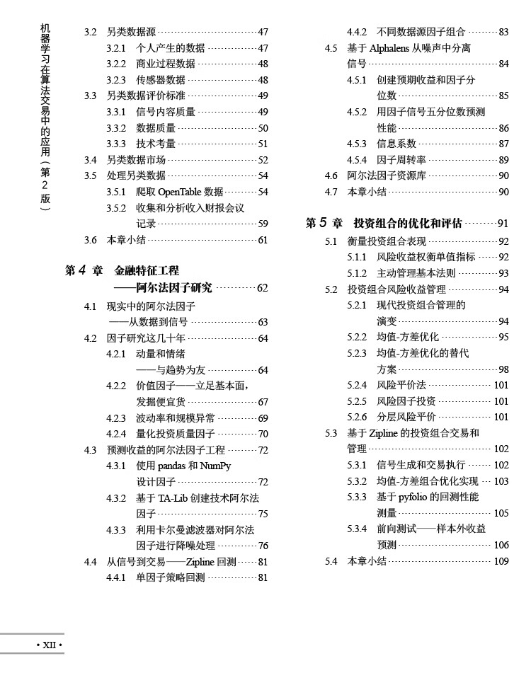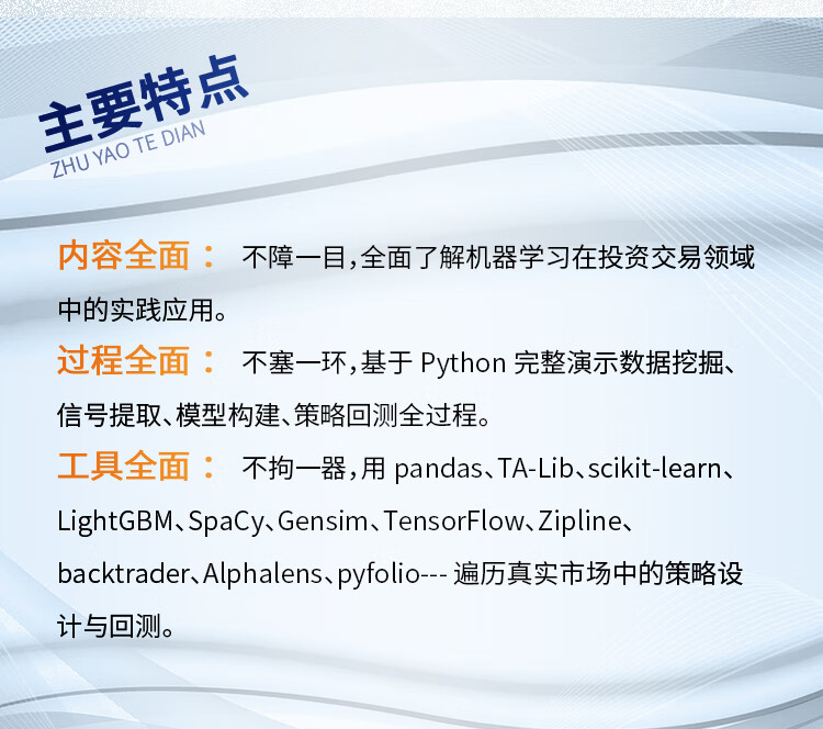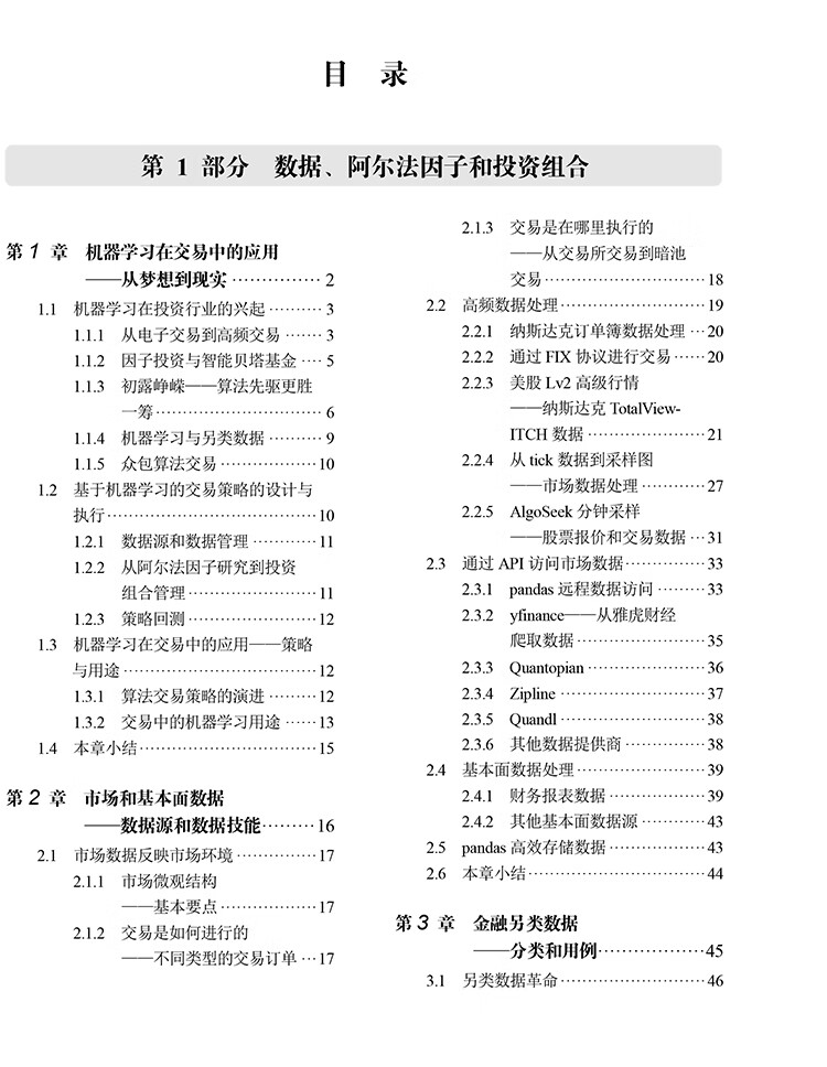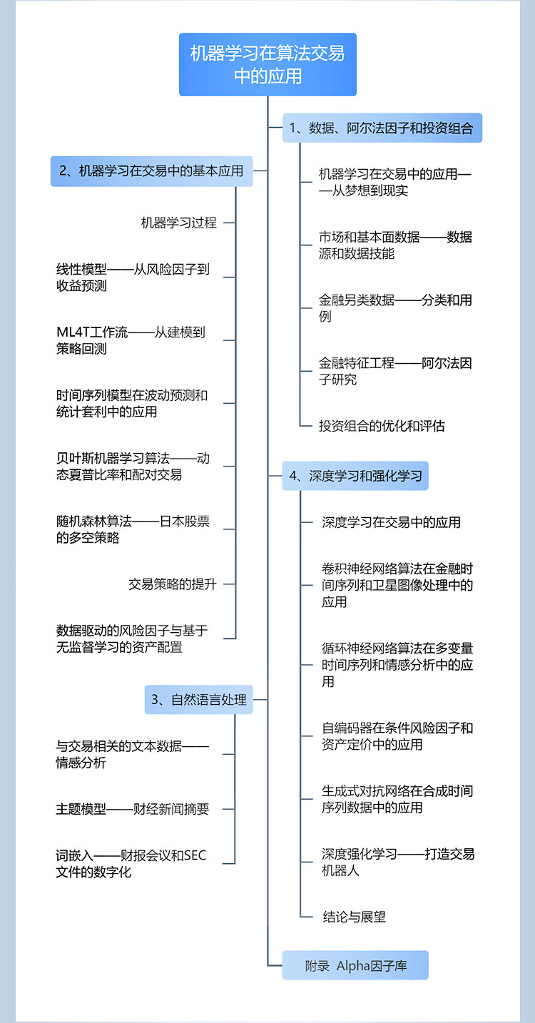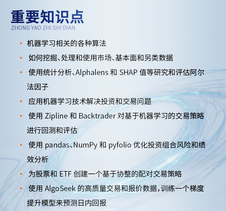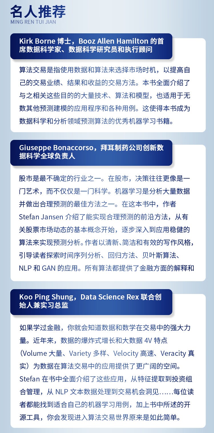 人工智慧時代,數位數據的爆炸式增長推動了人們對使用機器學習(ML)的交易策略相關知識的需求。 《機器學習在算法交易中的應用(第2版)》就以Python為基本工具,從全域、戰畧的視角介紹了相關的概念,以及機器學習在交易策略設計和執行中的價值及實踐運用。 全書分4部分,其中第1部分主要介紹基於機器學習的交易策略的基礎知識,該部分內容圍繞機器學習算灋以及交易策略相關的數據展開,概述了如何有效捕獲數據訊號內容、如何準確選取特徵,以及如何基於這些數據優化算灋評估投資組合。 第2部分重點闡述了在端到端工作流環境中,一些基本的監督學習、無監督學習是如何為交易策略的製定提供幫助的。 第3部分是自然語言處理,這部分引入了無監督學習算灋,力求從文字數據這種最關鍵的另類數據中高質量地選取訊號。 第4部分通過TensorFlow和PyTorch,重點介紹深度學習和强化學習在交易策略設計中的應用。