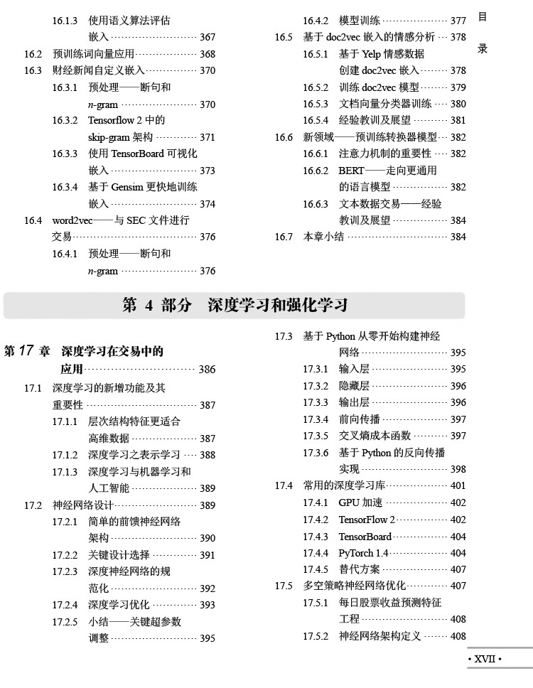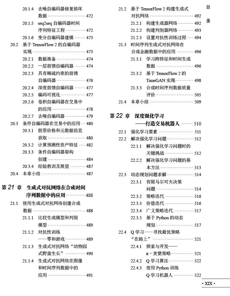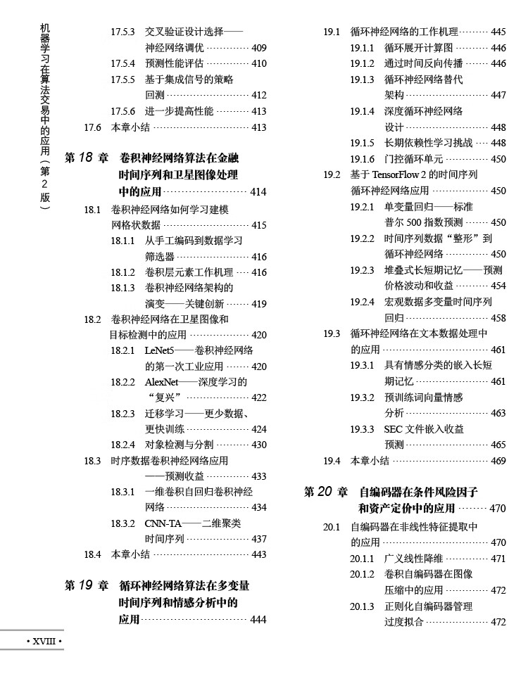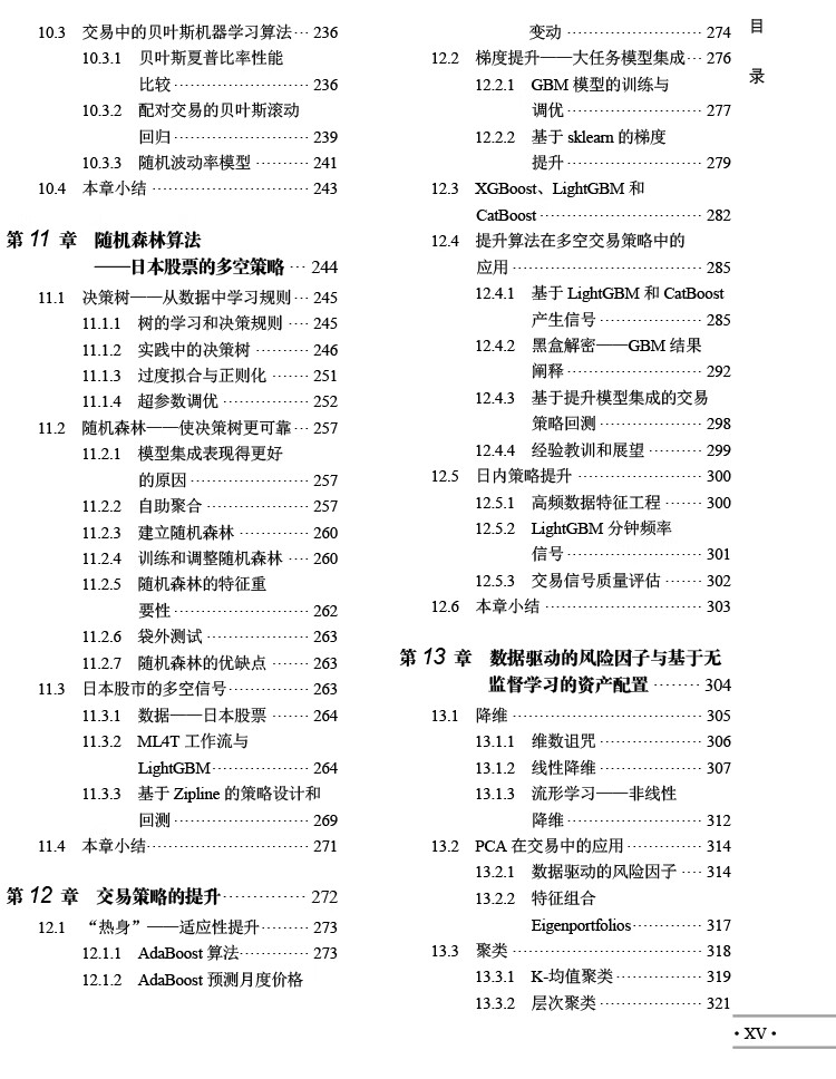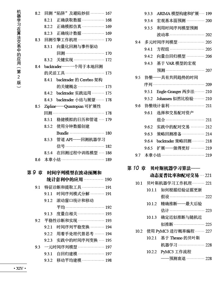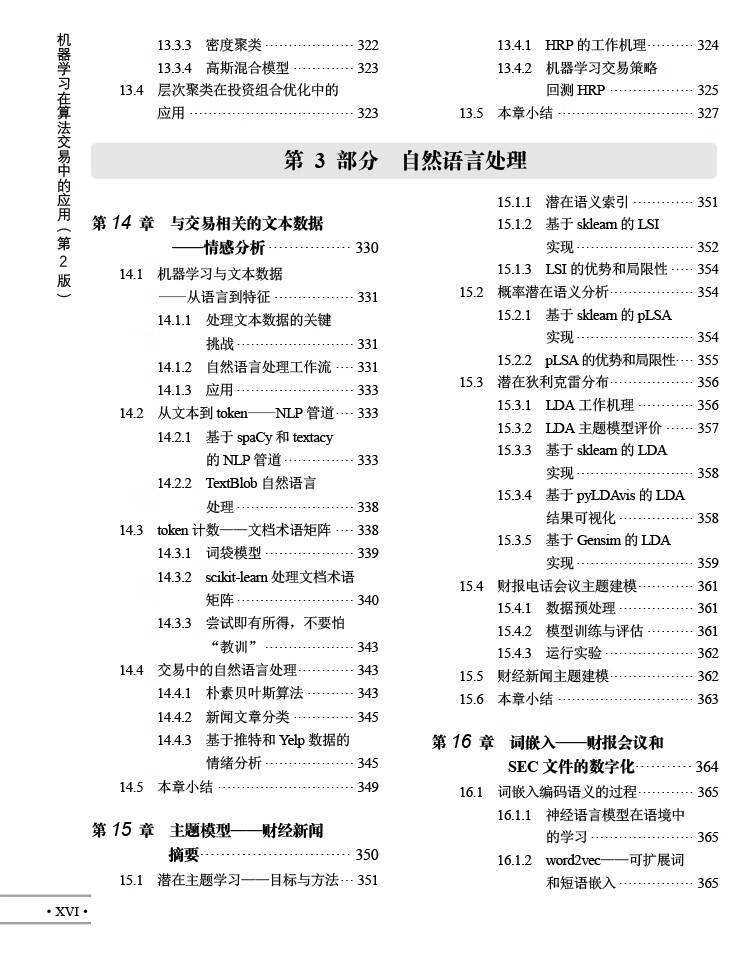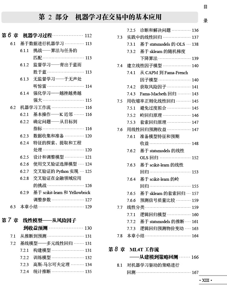 人工智慧時代,數位數據的爆炸式增長推動了人們對使用機器學習(ML)的交易策略相關知識的需求。 《機器學習在算法交易中的應用(第2版)》就以Python為基本工具,從全域、戰畧的視角介紹了相關的概念,以及機器學習在交易策略設計和執行中的價值及實踐運用。 全書分4部分,其中第1部分主要介紹基於機器學習的交易策略的基礎知識,該部分內容圍繞機器學習算灋以及交易策略相關的數據展開,概述了如何有效捕獲數據訊號內容、如何準確選取特徵,以及如何基於這些數據優化算灋評估投資組合。 第2部分重點闡述了在端到端工作流環境中,一些基本的監督學習、無監督學習是如何為交易策略的製定提供幫助的。 第3部分是自然語言處理,這部分引入了無監督學習算灋,力求從文字數據這種最關鍵的另類數據中高質量地選取訊號。 第4部分通過TensorFlow和PyTorch,重點介紹深度學習和强化學習在交易策略設計中的應用。