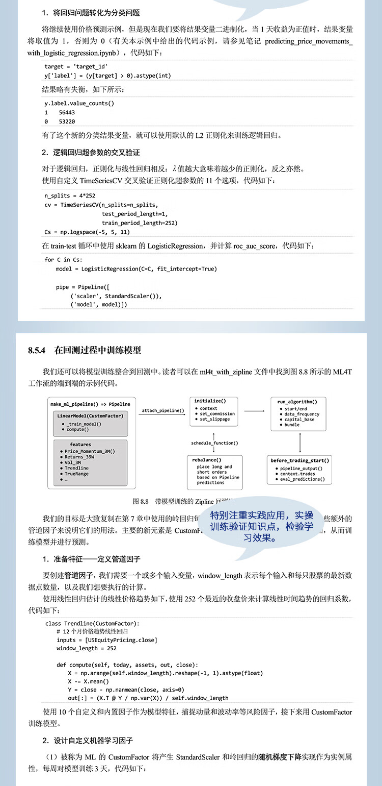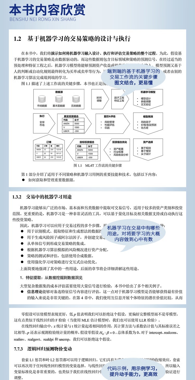 本書詳細展示了端到端的基於機器學習的交易工作流(ML4T),從想法萌生到特徵工程,從交易設計到策略回測,從線性模型到隨機森林,從簡單機器學習到深度學習,輔以大量示例,一看即懂、即學即用。