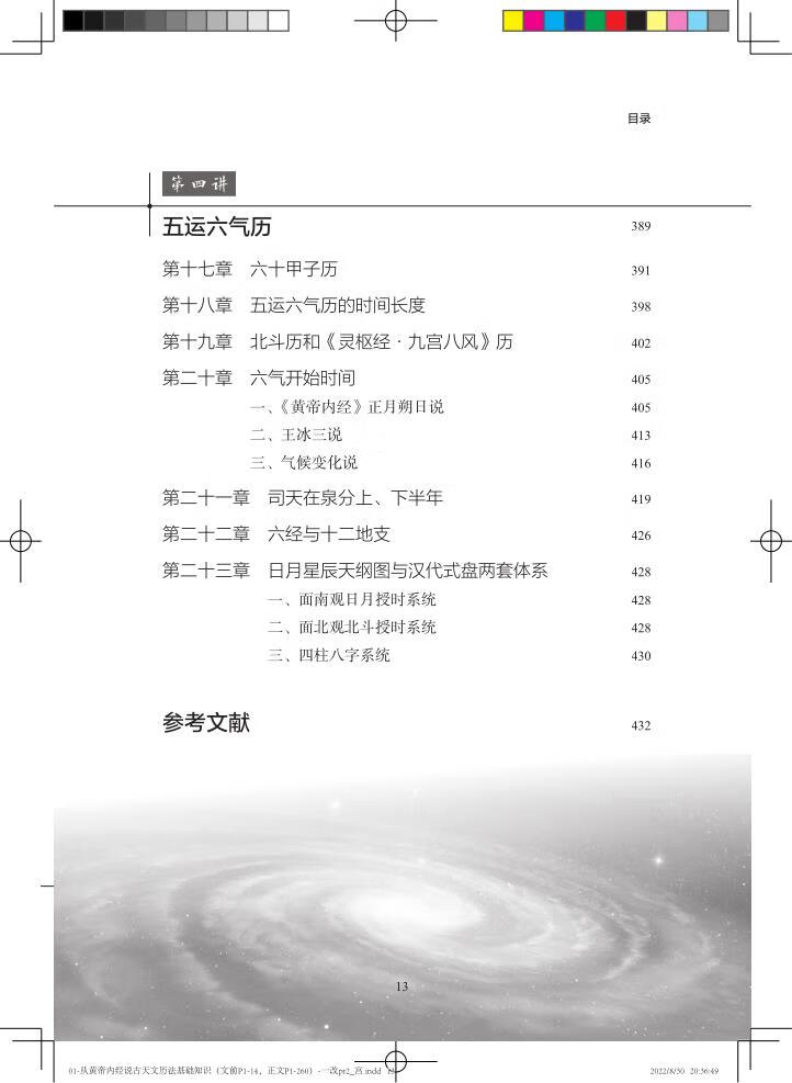 《黃帝內經·素問·氣交變大論》曰:“夫道者,上知天文,下知地理,中知人事,可以長久。” 《黃帝內經》主要講天、地、人三才三件大事,而以天道為主。 中醫就是以天道明醫道的醫學體系。 本書追本溯源,在全面解讀天文曆法基礎知識的基礎上,突出天文曆法在中醫學中的應用,是一部論述天文曆法和中醫辨證論治、中醫理法方藥的圖書,是研究五運六氣的基礎知識的一部分,是中醫理論的重要基礎部分,是廣大中醫愛好者和中醫學子在學習時必須掌握的基礎知識。 本書內容詳實,圖文並茂,通俗易懂。