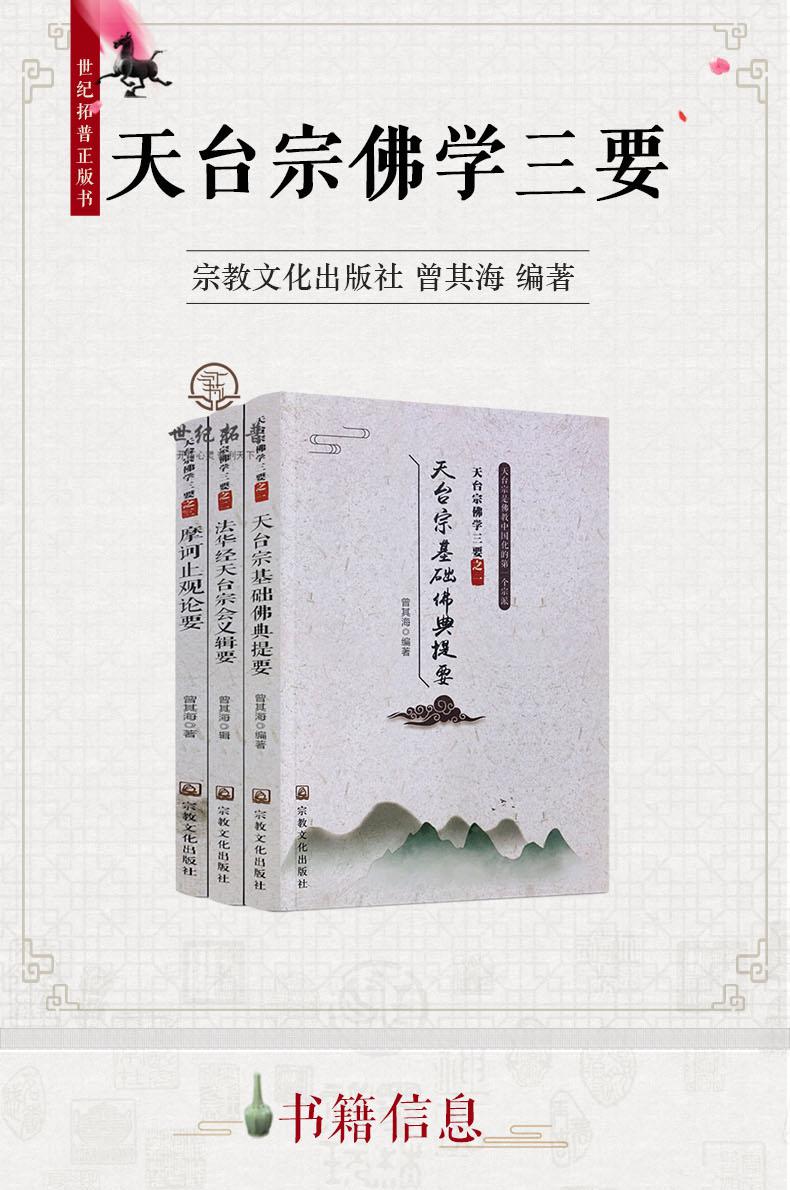 《天臺宗佛學三要(套裝共3册)》包括:《天臺宗佛學三要之一·天臺宗基礎佛典提要》、《天臺宗佛學三要之三·摩訶止觀論要》、《天臺宗佛學三要之四·法華經天臺宗會議輯要》。