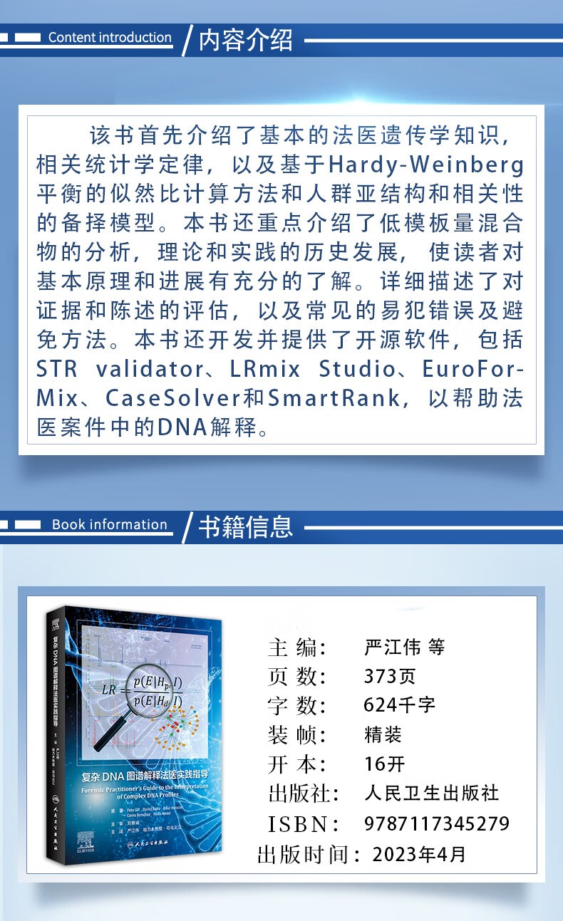 該書首先介紹了基本的法醫遺傳學知識,相關統計學定律,以及基於Hardy-Weinberg平衡的似然比計算方法和人群亞結構和相關性的備擇模型。 本書還重點介紹了低範本量混合物的分析,理論和實踐的歷史發展,使讀者對基本原理和進展有充分的瞭解。 詳細描述了對證據和陳述的評估,以及常見的易犯錯誤及避免方法。 本書還開發並提供了開源軟件,包括STR validator、LRmix Studio、EuroForMix、CaseSolver和SmartRank,以幫助法醫案件中的DNA解釋。