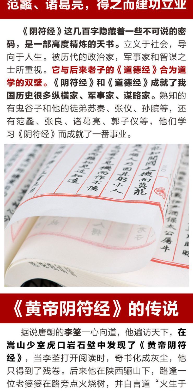 融匯易、老、兵等諸家思想。 全篇文字簡練,用語奇特,見識超卓,可謂字字珠璣,深含至理。 差不多所有輔佐帝王偉業的軍師,比如鬼穀子、姜太公、範蠡、張良、諸葛亮等,都注解過《黃帝陰符經》。