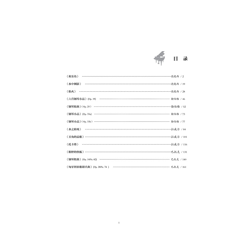 出於方便讀者按時間線索對本書作品進行查閱的考量,本書是按照作曲家出生時間的先後順序排列目錄。為了方便讀者更快捷地了解作曲家及其作品,本書對於選編的作曲家及其作品進行了文字簡介。本書還在每一首作品簡介中附有鏈接對應作品音頻資料的二維碼,以便讀者以簡明快捷的方式欣賞樂曲。期望本書的多維性架構能夠更好地滿足讀者學習和鑒賞20世紀的世界鋼琴音樂文化成果的需要。