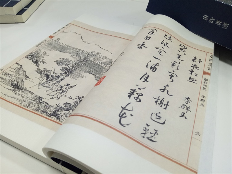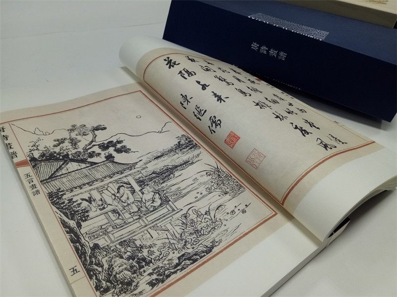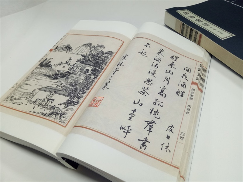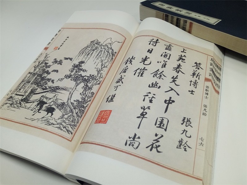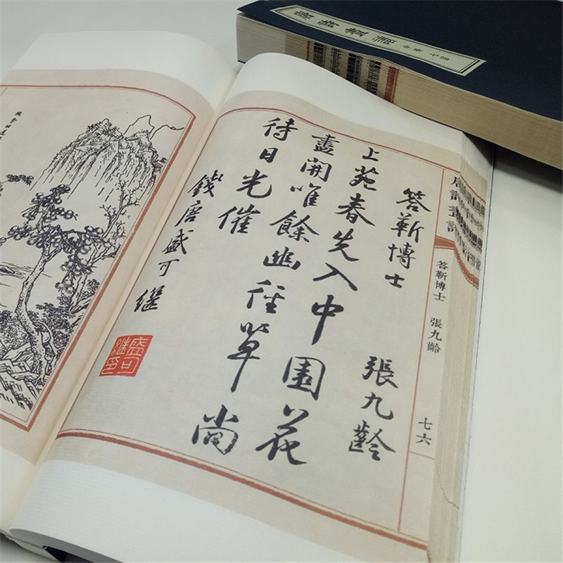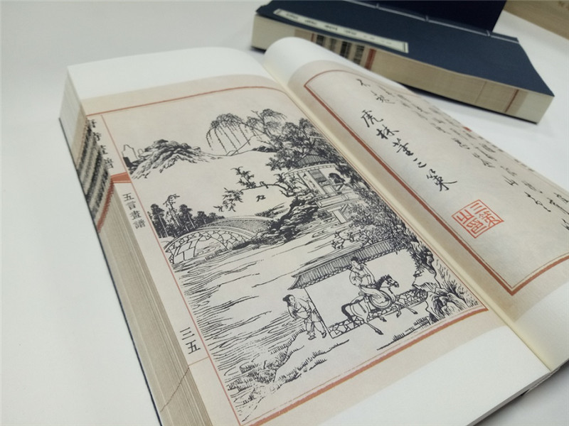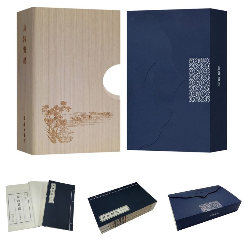 此次出版的唐詩畫譜採用宣紙、線裝,一函三冊,一詩一圖,文後附有每首唐詩的繁體詩文,便於讀者辨識,尤其是書中許多文字為行草書寫。我們採用140*230的線裝版本,並附有繁體詩文,便於作者玩味品讀,形式感與閱讀性兼具。