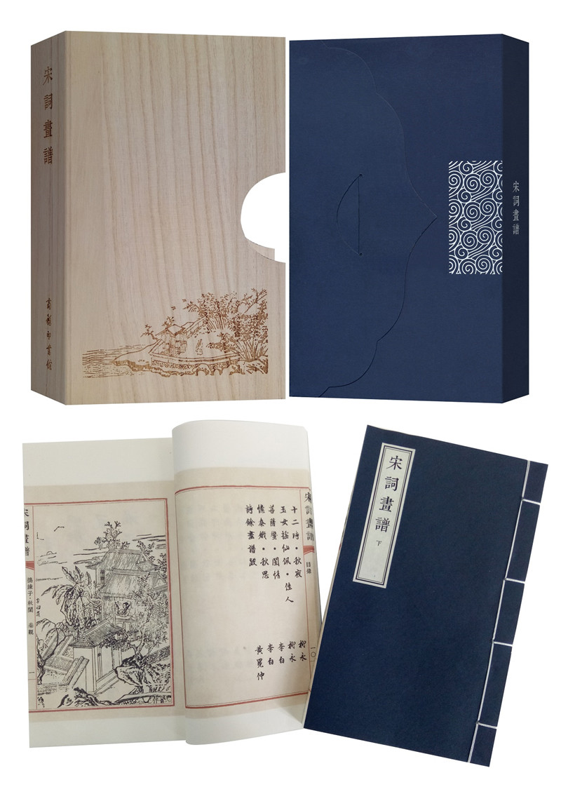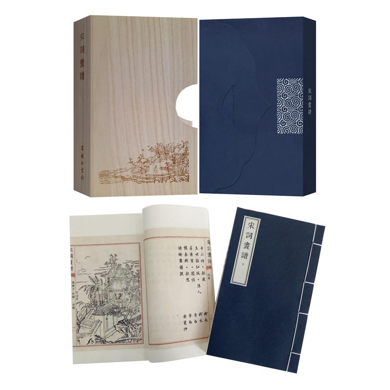 《宋詞畫譜》原名《詩馀畫譜》,刊行於萬曆四十年,由宛陵汪氏所輯印,是一部以詞配畫的宋名家詞作選本,集合了詞、書、畫、刻四絕,是晚明徽派版畫之精粹。編者依據《草堂詩馀》選取了宋詞名作百篇,書請名公董其昌、陳繼儒等、再由徽派木刻家摹刻歷代名家畫作,刻工精妙,一詞一圖,開創了中國古代版畫的鼎盛時期。之後《唐詩畫譜》等方紛然刊行。本書以明刻本為底本宣紙影印,線裝成冊,一函兩冊,最大程度保留原書風貌,文末附有每一篇詞作的原文,便於讀者對照辨識。