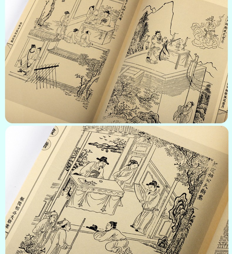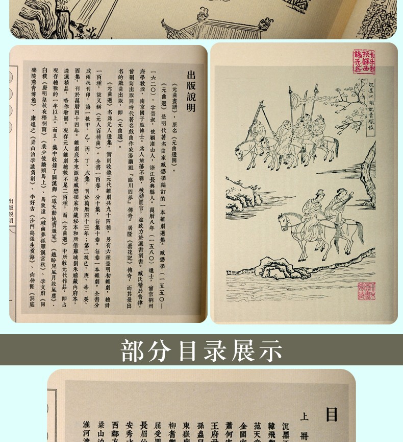 明人臧懋循所編《元曲選》,是一部著名的元雜劇選集,對元雜劇的傳播起了重要的作用。全書共10集,每集5卷,每卷1劇,共選錄100個劇本。每個劇本配兩幅圖,圖在前,文在後。本次出版,把其中的繡像圖單獨出版,選取萬曆年間刻本。