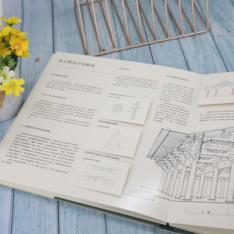 我們用這樣一部富於創意而又扎實的作品,真誠地邀請你走進五臺山,仔細看一看這座屹立千年的唐代遺構——佛光寺東大殿。 拉頁、翻翻頁等小機關(這些可不是孩子專屬!), 將梁林以來的建築史學研究積累,深入淺出地展現出來。 試試用比例縮小的營造尺量一量半透明黃油紙上的斗拱、梁架和平面設計圖,找到古代工匠的感覺。 文獻、檔案、碑刻、題記、一片小小的壁畫,就如同一條條線索,在抽絲剝繭般的推理遊戲中,古代建築的奧秘被一步步揭開。 而書中精心設計的立體結構,可以讓你直觀感受到什麼是蔚然唐風。 這一次,你一定能讀懂她!