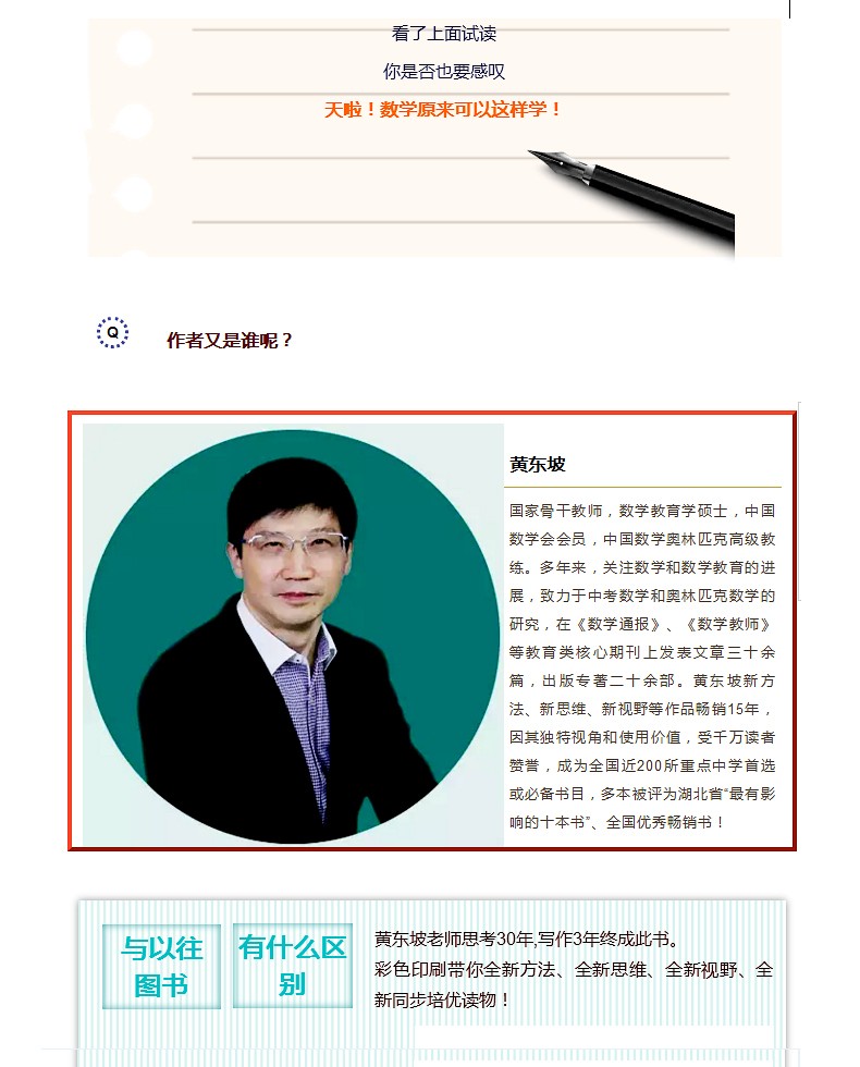 黃東坡,國家骨幹教師,數學教育學碩士,中國數學會會員,中國數學奧林匹克高級教練。 多年來,關注數學和數學教育的進展,致力於中考數學和奧林匹克數學的研究,在《數學通報》、《數學教師》等教育類核心期刊上發表文章三十餘篇,出版專著二十餘部。 黃東坡新方法、新思維、新視野等作品暢銷15年,因其獨特視角和使用價值,受千萬讀者讚譽,成為全國近200所重點中學或必備書目,多本被評為湖北省“有影響的十本書”!