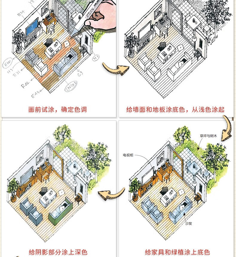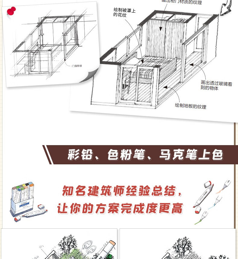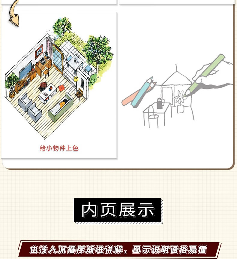 門窗開口部、各樓梯樣式、家具擺件等室內要素的繪製方法細緻講解,讓你的透視圖更俱生活氣息。