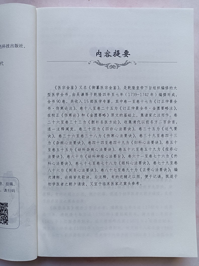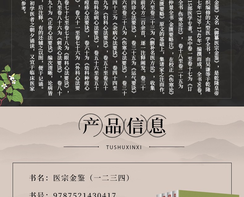本書由清・吳謙等編篡,成書於清乾隆七年(1742),全書分15篇,共90卷。其中《傷寒》、《金匱》兩篇集各家註解之大成,其他各篇則以歌訣形式,內容涉及內、外、婦、兒、眼、針灸、正骨等各科的辨證治療,圖文並茂,並彙集了大量方劑。本書堪為醫學入門之佳作,適合各科醫師臨證參閱。此次整理以清乾隆七年武英殿刻本為底本,參校人民衛生出版社1982年鉛排本及《傷寒論》、《金匱要略》等書校注而成。