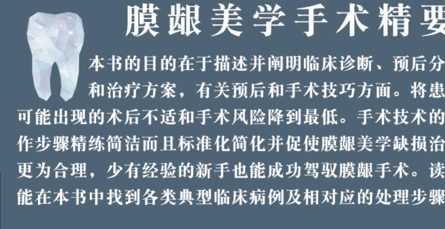膜齦美學手術用於治療膜齦美學的异常改變。 這些异常改變可能是由牙齦退縮導致的,且常常伴發非齲性頸部病變/或根面齲,另外與之相反的情况是,被動萌出异常也會導致膜齦美學的异常改變。 膜齦美學手術的目的還包括新增修復體或種植體周圍的牙齦厚度和高度,以及無牙區牙槽脊上的軟組織增量。 無牙區牙槽脊增量手術科技將在第二卷書中探討。 本卷中所描述及闡明的膜齦手術科技是應用於天然牙和種植體,且其主要目的是滿足患者的美學需求。